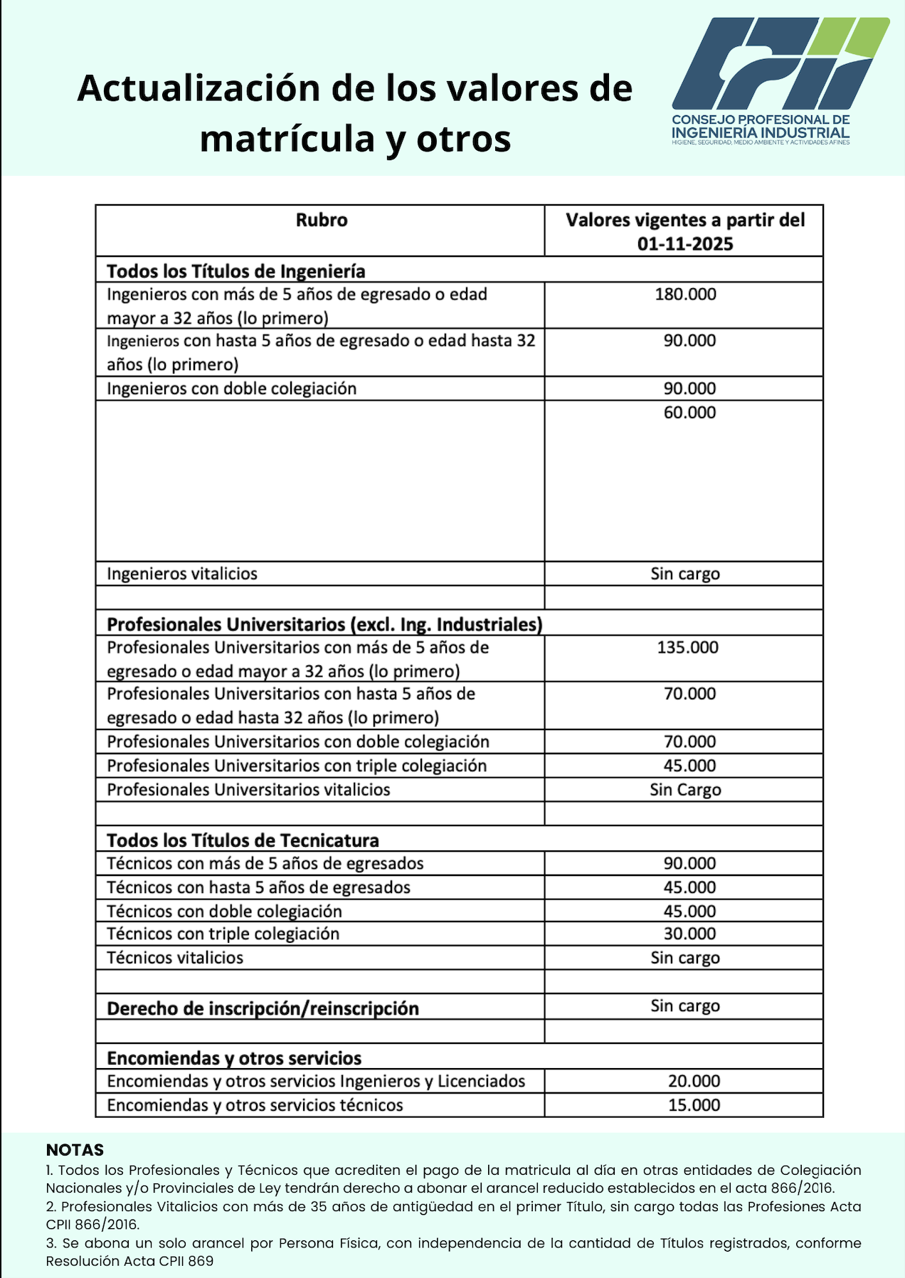 El Consejo Profesional de Ingeniería Industrial (CPII) informa a sus matriculados que, a partir del 1° de noviembre de 2025, entran en vigencia los nuevos valores de Matrículas y Otros Aranceles.